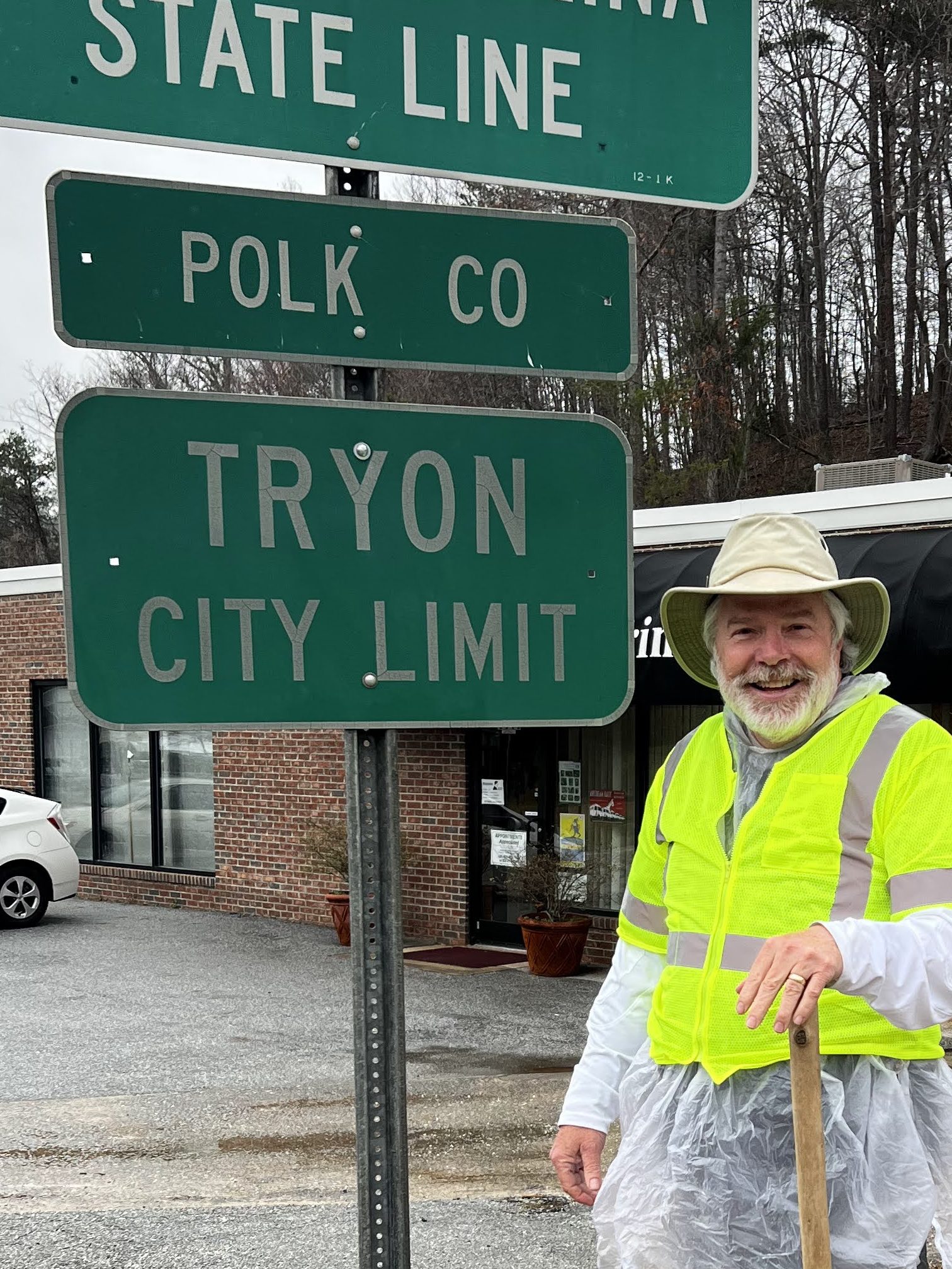 Jim and I drove to Tryon, parked the car near the state sign, and stepped out into the light rain.