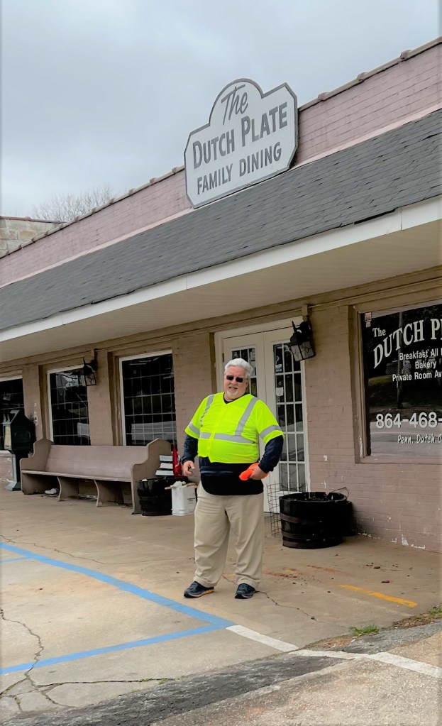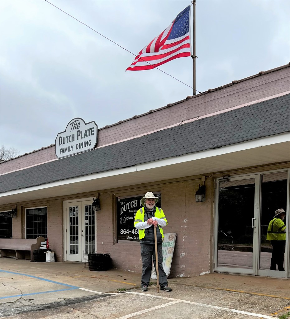 Six and a half miles east of Tryon is the little town of Campobello. My friend Jim Hunter, another retired United Methodist minister and quite an avid walker himself offered to walk with me on some of these first sections. We decided to meet in Campobello at the Dutch Plate Diner, leave one car there, drive up to Tryon, and walk back. I got to the Dutch Plate about 20 minutes before Jim, got out of the car, pushed the buttons on the door to lock it, and walked in. I sat down in the diner, ordered a cup of coffee from the nice waitress, and realized I had locked my keys in the car. Thirty minutes later and eighty-five dollars lighter, I got my keys. Patrick Farrell, the owner of the Dutch Plate was very friendly, He asked about what I was doing and wanted to know if I needed anything. Years ago I read Blue Highways by William Least Heat-Moon. As he traveled across the country on the small highways, the ones printed in blue on the maps, he stopped at a lot of diners. He said you could tell how good one was by the number of different insurance company calendars on the check-out counter. The Dutch Plate had four. I plan to eat there next time I come through.