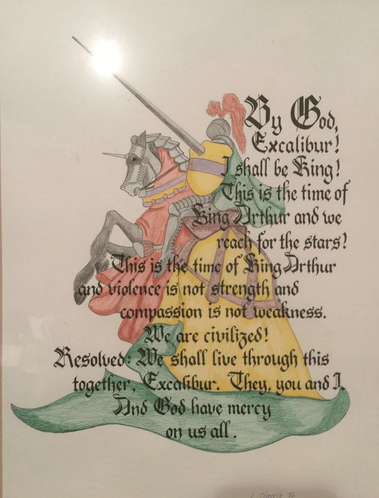 As I was praying this morning, I remembered a drawing that I have yet to hang up in my new home. (We’ve not hung any pictures yet.) Thirty years ago I met an artist in Hendersonville who did wonderful works with crayon and ink. She made a drawing for me of my favorite quote from Camelot (based on the book The Once and Future King, by T.H White). Here’s the quote:
